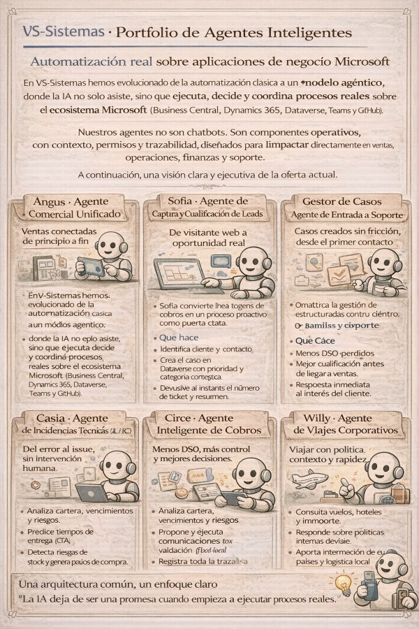 En VS Sistemas llevamos la IA más allá de la experimentación con una idea clara: el ERP ya no es solo una herramienta para usuarios, sino una plataforma operada por agentes. Por eso estamos construyendo un portfolio coherente de agentes y extensiones que nacen de procesos reales, con un enfoque deliberado: API-first y Agent Friendly. El objetivo no es “tener agentes”. Es tener una operativa más rápida, trazable y consistente.